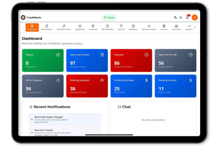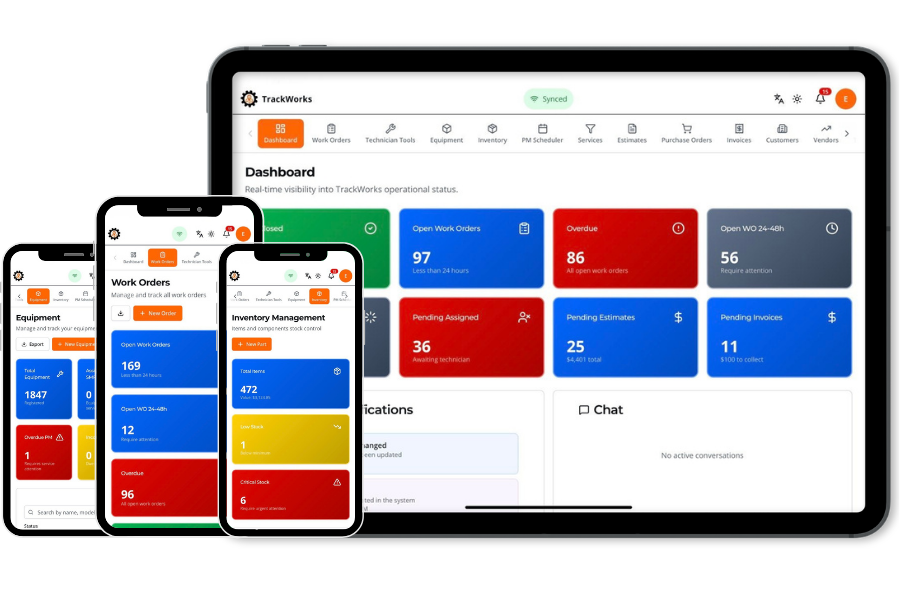 With both a web dashboard for managers and a mobile app for technicians, TrackWorks gives you real-time control over work orders, technician tracking, equipment inventory, and service history.